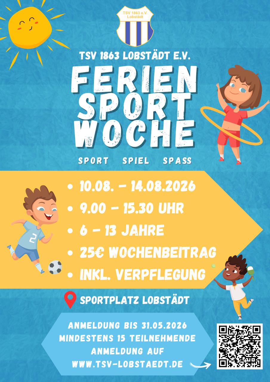 Unsere Feriensportwoche mit viel Sport & Spaß findet auch in diesem wieder Jahr statt. Vom 10.08. – 14.08.25 können sich die Kids (Schulalter bis 13 Jahre) wieder in verschiedenen Sportarten ausprobieren, kreative Spiele machen, baden gehen und vieles mehr. Wer darauf Lust hat meldet sich schnell an, die Plätze sind begrenzt. Wir freuen uns auf Euch.